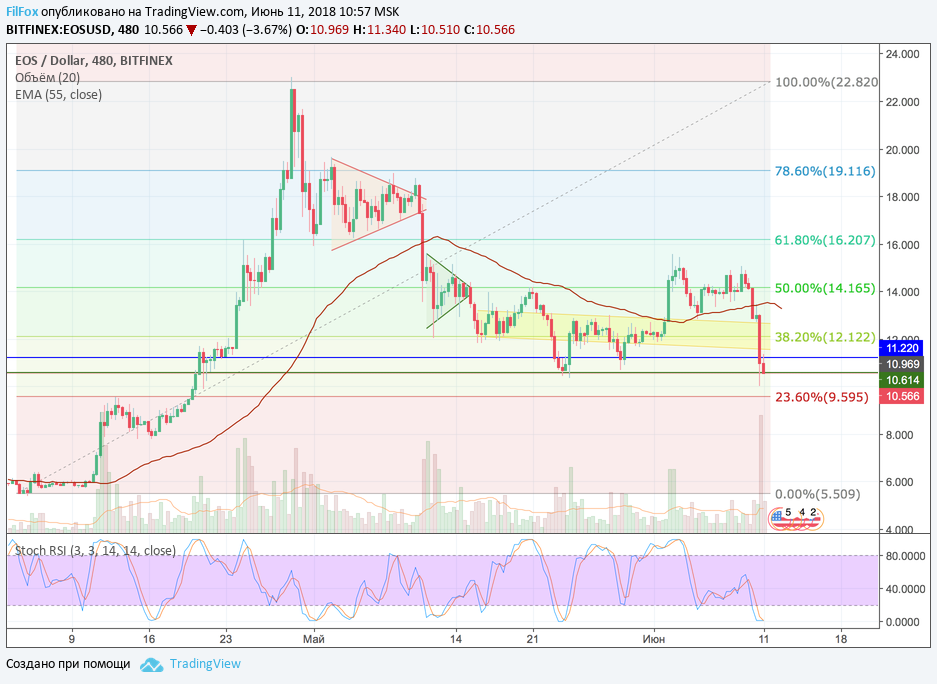 После ре-теста верхней границы желтого коридора в воскресенье пара на большой скорости пробила желтый коридор консолидации, только слегка притормозив на поддержке 38.2% фибо (12.12 USD). На восьмичасовом тайм-фэйме эта задержка вообще не заметна. После минимума в точке 10.01 USD цена отскочила в зону консолидации между двумя силовыми уровнями 11.22 USD и 10.61 USD. Полагаем, что после этого снижение продолжится к уровню 23.6% фибо (9.595 USD), а ближайшая цель находится на уровне 7.900 USD