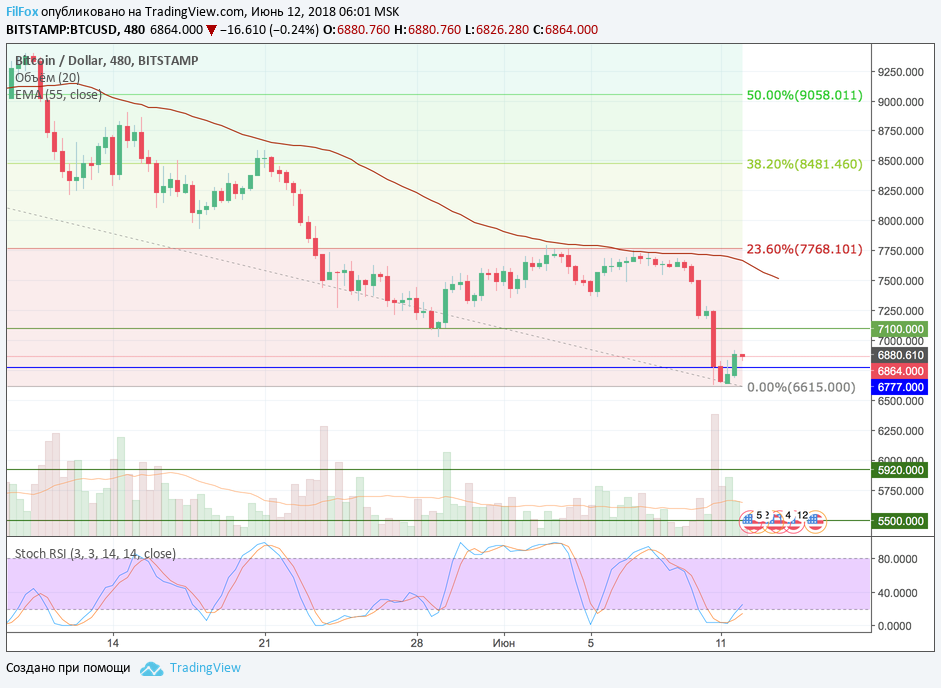 Вчера Bitcoin консолидировался в области цен 6777.00 USD, причём максимум отскока установлен на отметке 6919.97 USD. Характер восстановления был слабым и вялотекущим. Продолжительное время цена консолидировалась чуть ниже силового уровня, но всё же смогла его преодолеть на средних объёмах. В ближайшее время восстановление закончится в районе отметки 7000.00 USD и возобновится снижение к нулевому уровню фибоначчи 6615.00 USD. Пробой этого уровня будет началом импульса для нового локального минимума в области 6300.00 USD.