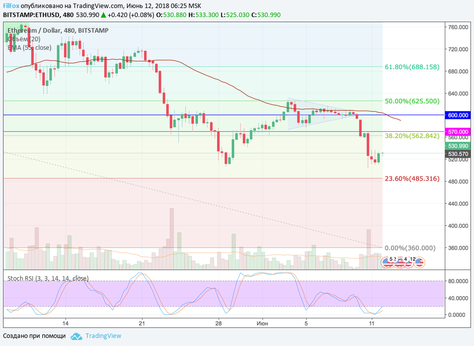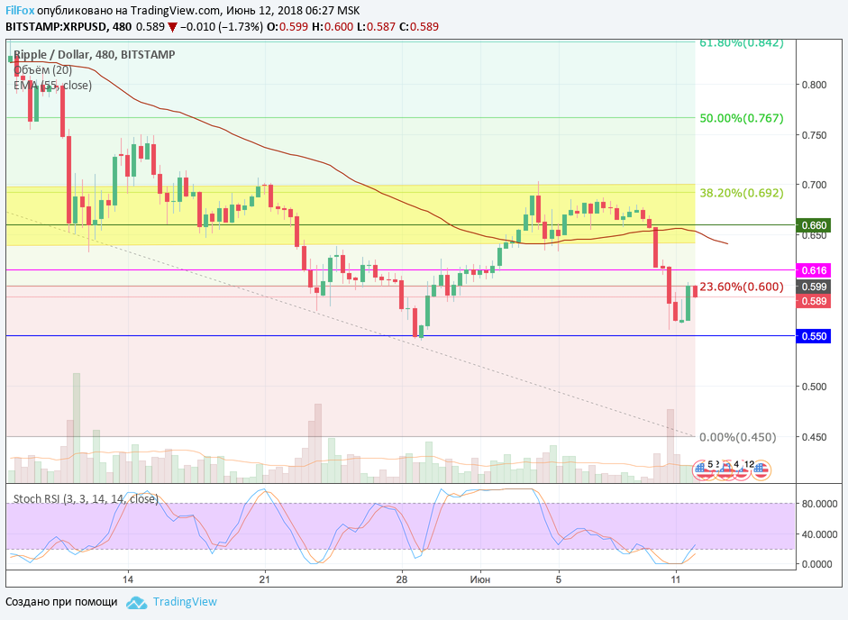 Цена Ripple вчера довольно динамично восстанавливалась и даже проколола сопротивление уровня 23.6% фибо (0.600 USD). В ближайшее время консолидация закончится, и цена, скорее всего, обновит вчерашний "красивый" минимум 0.555 USD на менее «благовидный» 0.513 USD.
