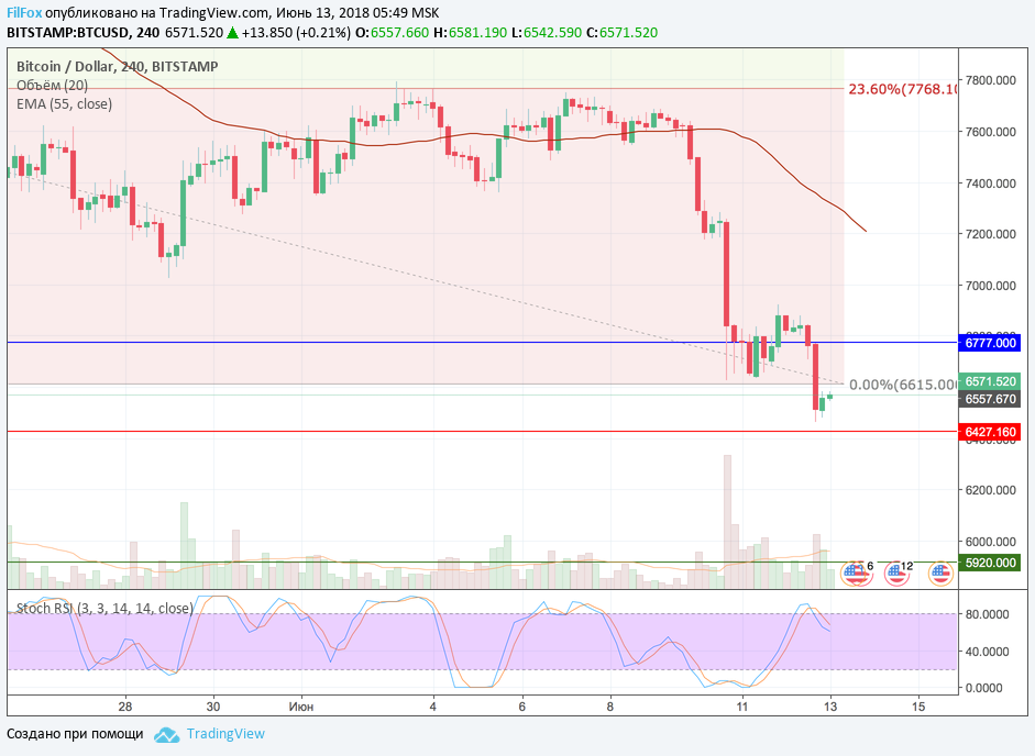 Вчера, после пробоя нулевого уровня фибоначчи 6615.00 USD, цена Bitcoin установила локальный минимум на отметке 6461.42 USD. Медвежьего импульса не хватило, чтобы обновить первоапрельский минимум, зафиксированный на уровне 6427.16 USD. Сейчас пара BTC/USD откатывается к сопротивлению 0% фибо (6615.00 USD). После его ре-теста, снижение продолжится и уровень первоапрельского минимума будет преодолён. Далее, спускаться в низ, цена будет более осторожно, зависая в боковиках.