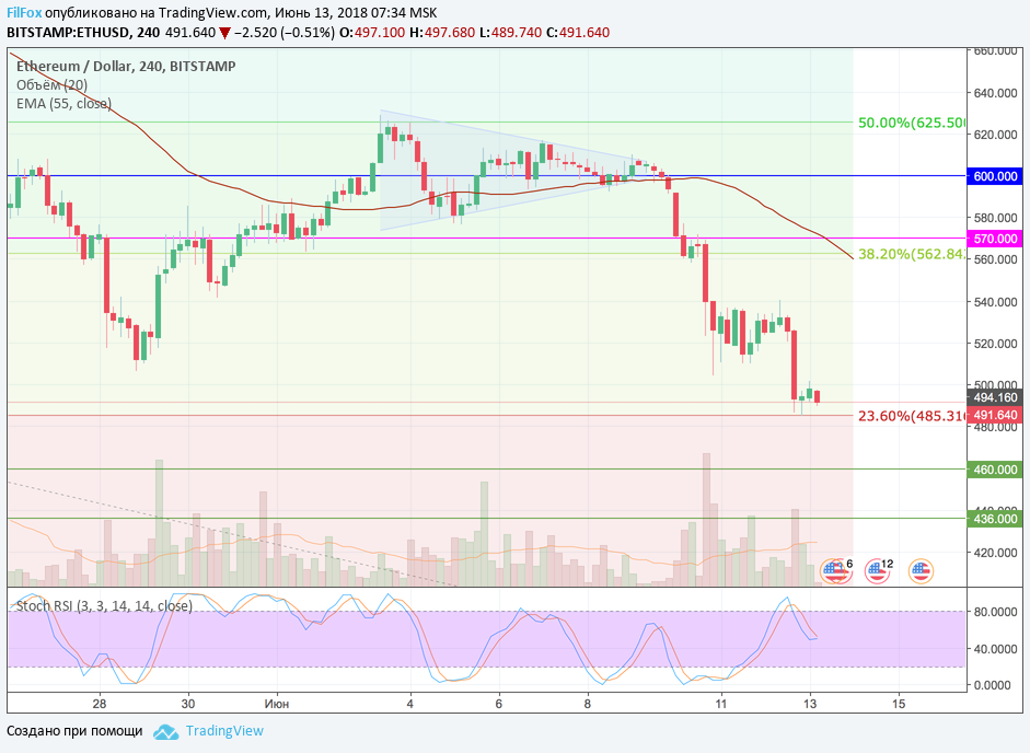 Вчера, восстановившись в область 540.00 USD, пара ETH/USD, соблюдая синхронность с парой BTC/USD, «нырнула» к прогнозируемому уровню поддержки 23.6% фибо (485.31 USD). Это временная остановка перед очередным снижением, которое будет уже не такое интенсивное. Сегодня, после небольшого отскока от этого уровня поддержки, цена пробьёт его и начнёт снижение в более медленном темпе, используя зелёные линии 460.00 USD и 436.00 USD для консолидации и восстановления.