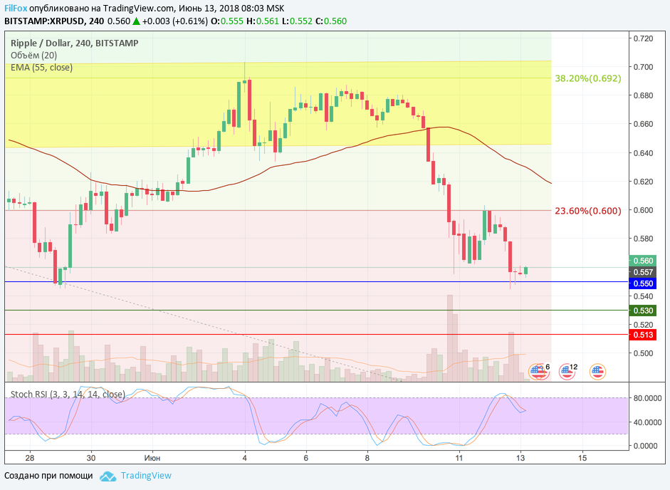 Вчерашнее восстановление Ripple закончилось на уровне сопротивления 23.6% фибо (0.600 USD). Цена возобновила снижение и обновила предыдущий локальный минимум на отметке 0.555 USD до уровня 0.544 USD. Сегодня, после консолидации над уровнем поддержки 0.550 USD, цена может восстановиться до отметки 0.560 USD. Падение вскоре продолжится, но будет не таким интенсивным, как в предыдущие два дня. К целевому минимуму 0.513 USD пара будет снижаться, импровизируя на уровне поддержки 0.530 USD.