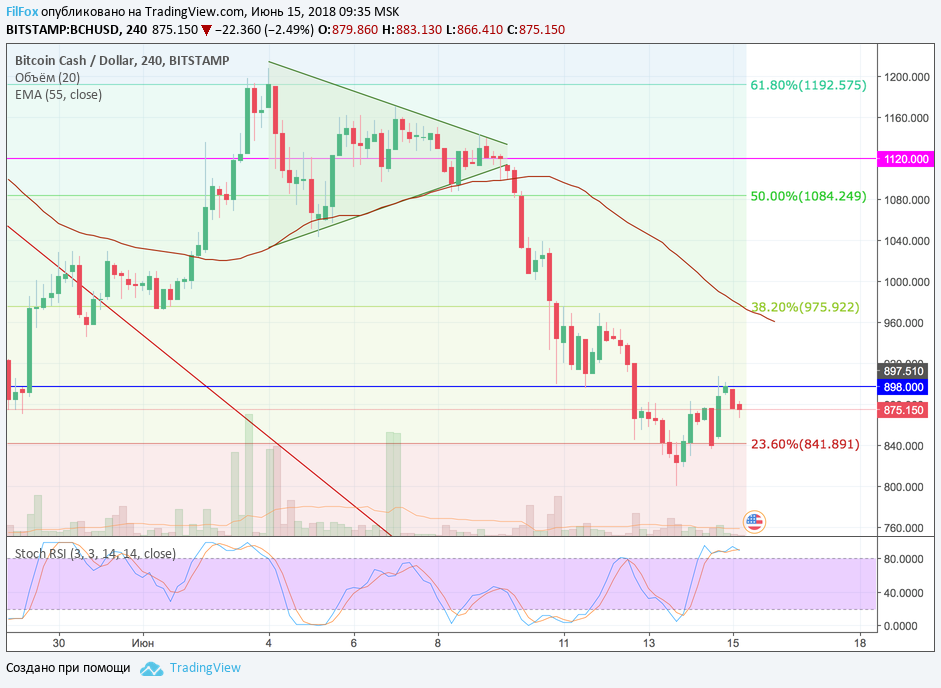 Вчерашняя консолидация Bitcoin Cash проходила в широком диапазоне между уровнем поддержки 23.6% фибо (841.89 USD) и сопротивлением 898.00 USD. На восстановлении пара только проколола этот уровень, но закрепиться выше него не хватило сил. Объёмы покупок на дневном максимуме были очень маленькими. Это сигнал предстоящего изменения направления в рамках боковика.