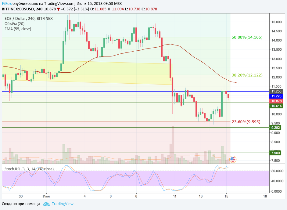Вчера EOS на восстановлении пробил уровень 10.61 USD и разогнался до максимальной дневной точки 11.64 USD. Но уровень 11.22 USD развернул цену в диапазон сегодняшней консолидации пары. Этот диапазон будет ограничиваться синей линией сопротивления 11.22 USD и зелёной линией поддержки 10.61 USD. Однако, неопределённость участников рынка может спровоцировать расширение диапазона до уровня поддержки 23.6% фибо (9.595 USD).