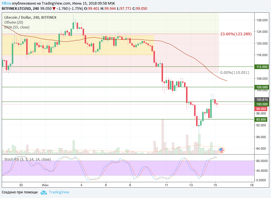 Быки вчера долго и упорно пытались поднять цену выше сто долларовой отметки. Воспользовавшись поддержкой уровня 93.93 USD пару LTC/USD удалось дотолкать до максимума 102.86 USD. Однако, уже сегодня утром, цена вновь откатилась в диапазон консолидации между 100.00 USD и 93.93 USD. Полагаем, что сегодня боковик продолжится и цена еще вернётся к сто долларовому уровню.