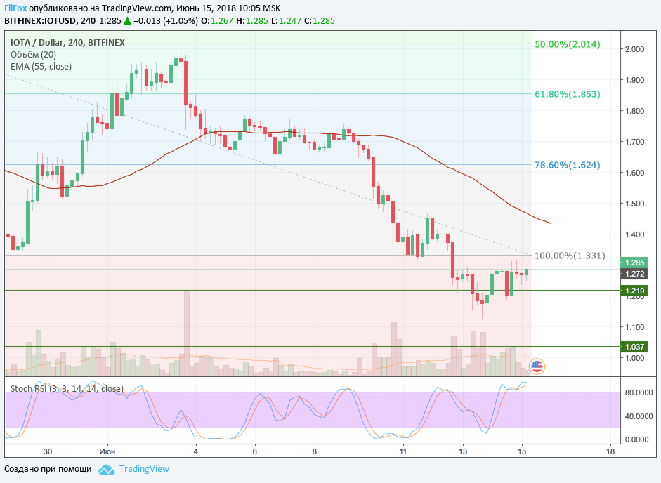 IOTA вчера консолидировалась в диапазоне между сопротивлением 100% фибо (1.331 USD) и поддержкой 1.20 USD. Сегодня боковик продолжится в этом же коридоре цен. Сужение диапазона возле уровня 1.270 будет сигналом к прорыву поддержки и снижению цены в область минимума, который был зафиксирован в среду.