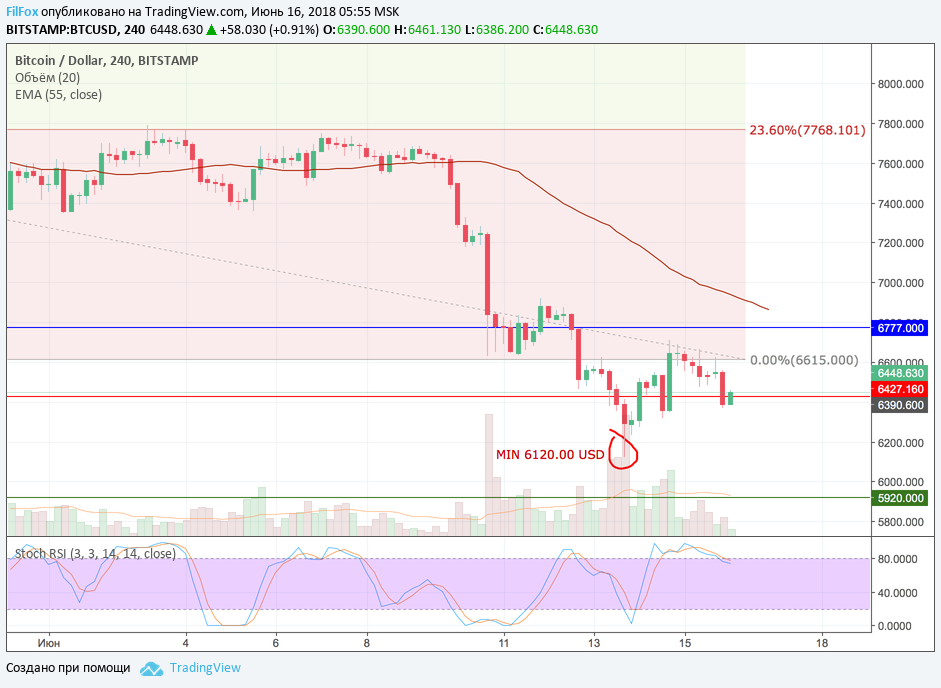 Вчера в течение дня цена Bitcoin консолидировалась под нулевым уровнем фибоначчи (6615.00 USD), но в итоге пара упала ниже красной линии 6427.16 USD, которая проведена через точку первоапрельского минимума. Зону ниже этой линии медведи захотят использовать в качестве коридора для консолидации пары, но так как здесь, на уровне 6120.00 USD находится июньский минимум, то быки будут стараться выскочить из этой потенциально опасной зоны и вернуться к уровню 0% фибо (6615.00 USD).