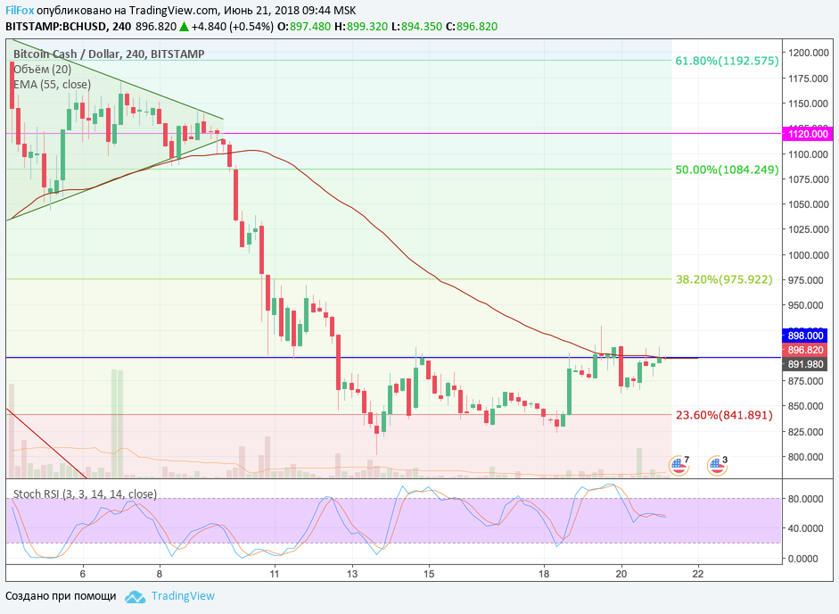 Вчера Bitcoin Cash находился под уровнем сопротивления 898.00 USD. За весь день цена только два раза проколола этот уровень, а всё остальное время колебалась в боковом направлении, сужая диапазон колебаний. На данный момент индикатор стохастик находится в нейтральной зоне, на отметке 55%. Сегодня боковое движение продолжится вокруг скользящей средней EMA55, которая полностью совпала с горизонтальной линией сопротивления на уровне 898.00 USD.