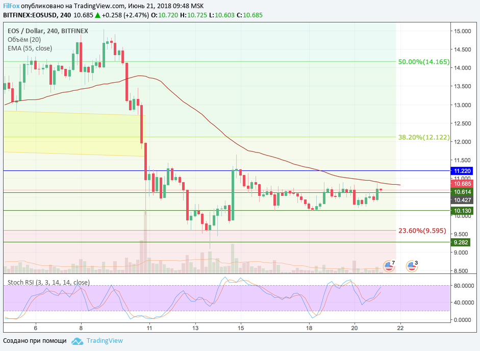 Вчера цена EOS, в вялотекущем боковике, смогла закрепиться чуть выше уровня 10.614 USD. Дальше не пускает сопротивление EMA55. Стохастик находится в нейтральной зоне, его показания пока не информативны, поэтому будем считать, что боковик вдоль зелёной линии 10.614 USD, сегодня продолжится. В уме держим сценарий, что пробой уровня сопротивления 11.22 USD приведёт к ре-тесту 38.2% фибо (12.12 USD), а прорыв поддержки на 10.13 USD, означает снижение к минимумам прошлой недели, в зону девяти долларов.