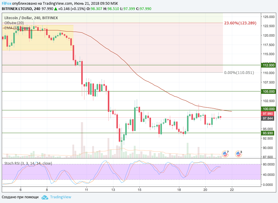 Litecoin вчера, как и все альткоины, тоже, лежал на боку, но диапазон был настолько узкий, что цена не протестировала ни верхнюю, ни нижнюю границу коридора. Даже немного удивительно, но покупатели не добрались до психологической отметки сто долларов, развернувшись на локальном максимуме 99.33 USD. А всё потому, что трейдеры предпочли понаблюдать за флэтом со стороны и объёмы торгов были очень маленькие.