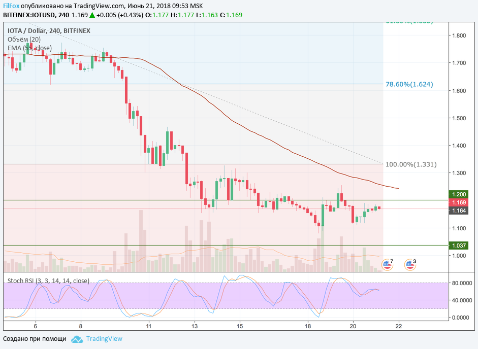 Вчера IOTA, двигаясь в боковике, после минимума 1,10 USD, плавно восстановилась к сопротивлению 1,20 USD, при этом объём торгов был выше средних. На не слабых объёмах протестировать это сопротивление всё равно не получилось. Цена залипла на уровне 1.17 USD. Полагаем, что сегодня, в рамках боковика, цена протестирует минимум, до которого чуть-чуть не добралась при вчерашнем снижении. Напомню, мы полагали фиксацию дневного минимума на отметки 1.05 USD.
