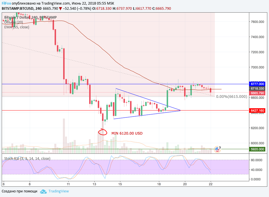 Вчера движение цены Bitcoin продолжалось во флэте. Когда очередной раз, цена протестировала уровень 6777.00 USD, сопротивление этого уровня, очередной раз, развернуло цену и вернуло в пределы бокового диапазона, к уровню средних цен. После, почти, двенадцатичасовой консолидации возле EMA55, цена пробила его и снизилась к нижней границе диапазона - нулевому уровню фибоноччи (6615.00 USD).