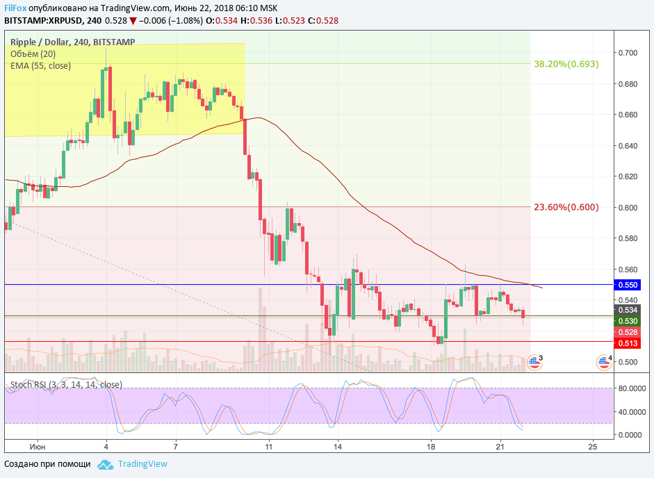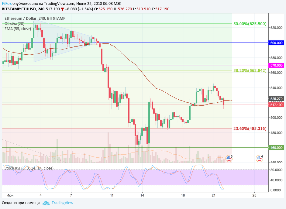 Вчера, уже который раз, где-то в области цен 540 доллар за эфир, цена Ethereum развернулась и начала снижение к поддержке в виде скользящей средней EMA55. Сегодня этот уровень средних цен уже пробит и на восьмичасовом тайм-фрэйме можно увидеть показания стохастика на снижение. Получит ли сегодня продолжение, начавшееся снижение эфира - точно сказать нельзя, даже при наличии индикатора, но вероятность ре-теста уровня 23.6% фибо (485.31 USD) - очень высока.