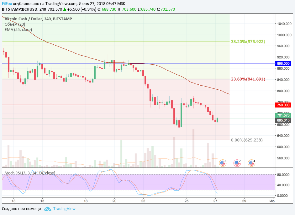 Вчера на нейтральном фундаментальном фоне, цена Bitcoin Cash постепенно снижалась от уровня консолидации 750.00 USD к нулевому уровню фибоначчи (625.23 USD). Котировки вчерашнего дня закрылись на отметке 695.00 USD.