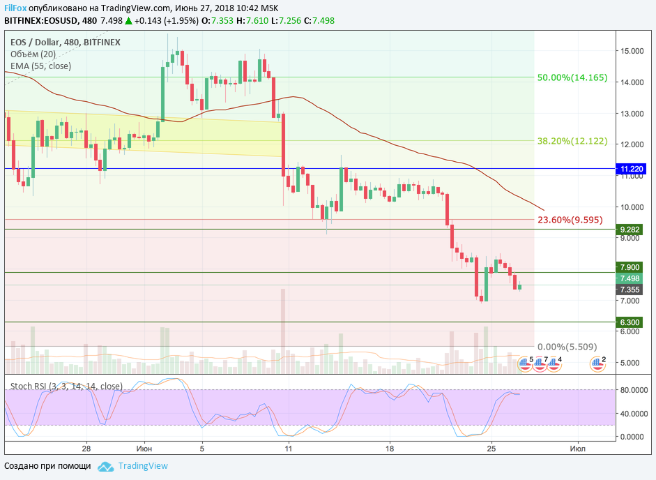 Вчера стохастик так и не вошел в зону перекупленности и сигнал на снижение ещё не сформирован. Несмотря на это, цена EOS постепенно падала, но в области 7.33 USD соскальзывание вниз приостановилось и сегодня сформировалась свеча на восстановление. Сигнальные линии индикатора переплетаются чуть ниже границы нейтральной зоны, следовательно потенциал на подъём пары в область 9.00 USD ещё существует.