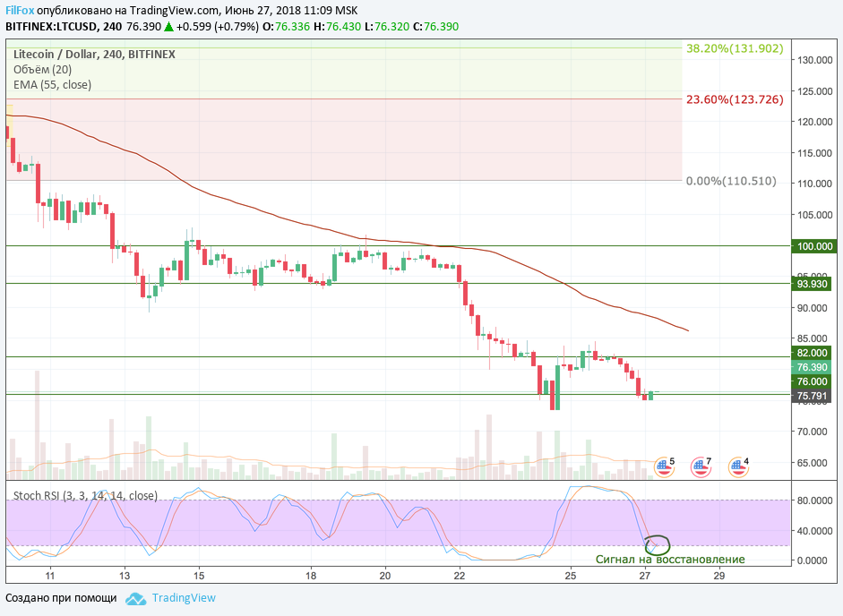 Litecoin (в строгом соответствии с нашим вчерашним прогнозом) от равновесного состояния 82.00 USD упал к уровню поддержки 76.00 USD. На индикаторе только что сформировался сигнал на восстановление пары LTC/USD. Полагаем, что цена сможет восстановиться выше вчерашнего равновесного уровня 82.00 USD к кривой скользящей средней EMA55, которая проходит в обасти 86.5 USD.