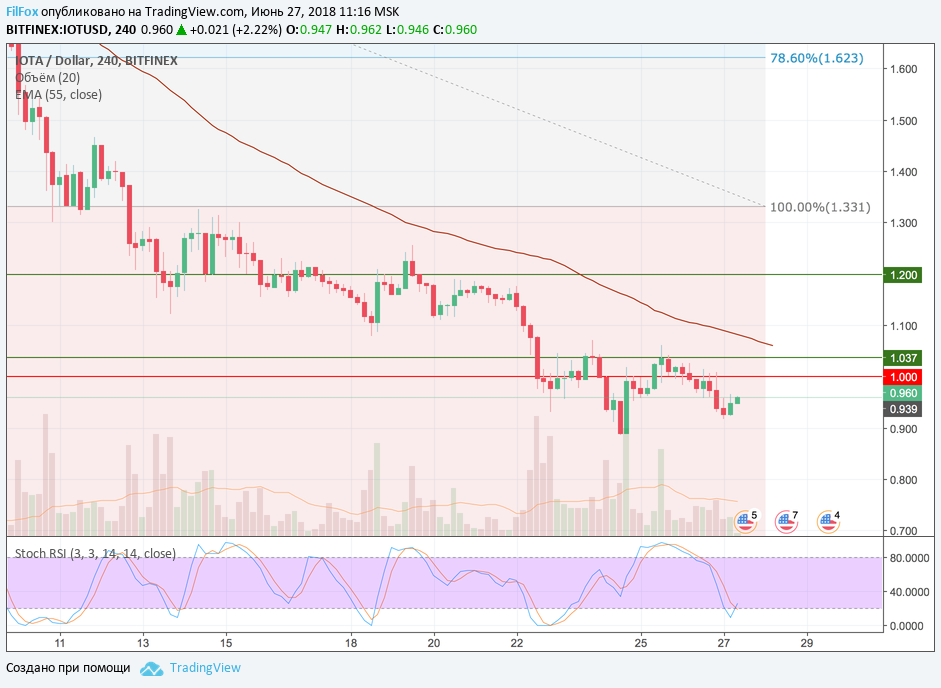 После того, как IOTA зафиксировала минимум в области 0.918 USD, индикатор стохастик на четырёхчасовом графике завершил формирование сигнала на рост пары IOTA/USD. Сейчас IOTA упорно стремится к паритету с долларом США. Полагаем, что сегодня курс пары пробьёт уровень 1.00 USD и даже сможет закрепиться чуть выше, под линией сопротивления 1.037 USD.