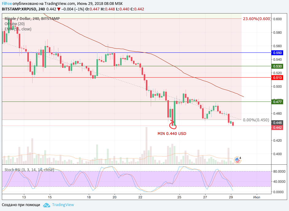Сегодняшний импульс на снижение пробил нулевой уровень фибоначчи (0.450 USD), который выступал поддержкой для Ripple и отправил цену в зону минимума, установленного в прошлое воскресенье, на отметке 0.440 USD. Наш вчерашний прогноз остаётся актуальный и сегодня. Целевая область снижения пары XRP/USD находится в области $0.42 - $0.40