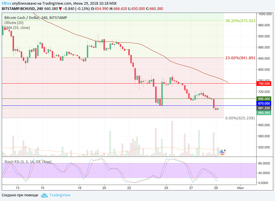 Вчерашняя консолидация возле уровня 695.00 USD закончилась прорывом этого уровня поддержки. Bitcoin Cash начал снижаться к целевой отметке - нулевому уровню фибоначи (625.23 USD).