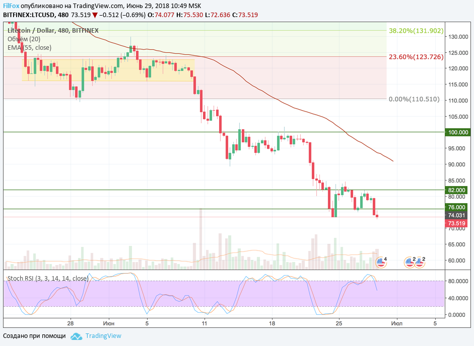 Вчера, пока Litecoin находился во флэте, стохастик в зоне перекупленности сформировал сигнал на снижение. Сегодня поддержка на уровне 76.00 USD не смогла вернуть пару в пределы боковика и была разорвана медвежьим импульсом с обновлением минимума прошлого воскресенья.