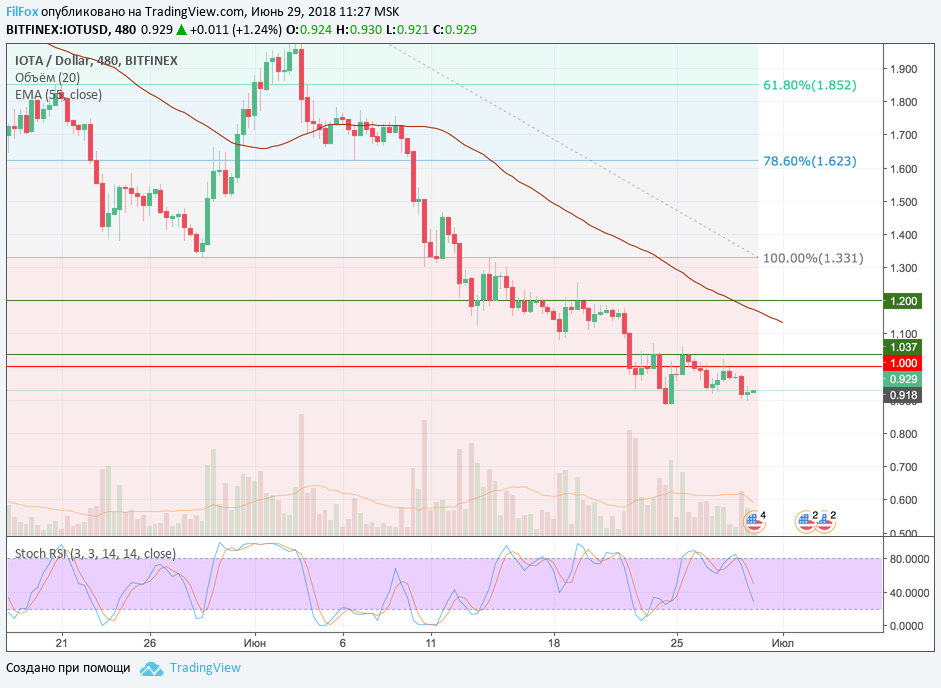 На восьмичасовом графике стохастик сформировал сигнал на снижение возле самой границы нейтральной зоны. Сейчас, когда покупатели пытаются перехватить инициативу, стохастик находится на отметке 33%. Вероятность дальнейшего снижения в зону перепроданности очень высока. Когда быстрая синяя линия индикатора достигнет её - пара IOTA/USD будет в районе отметки 0.884 USD.