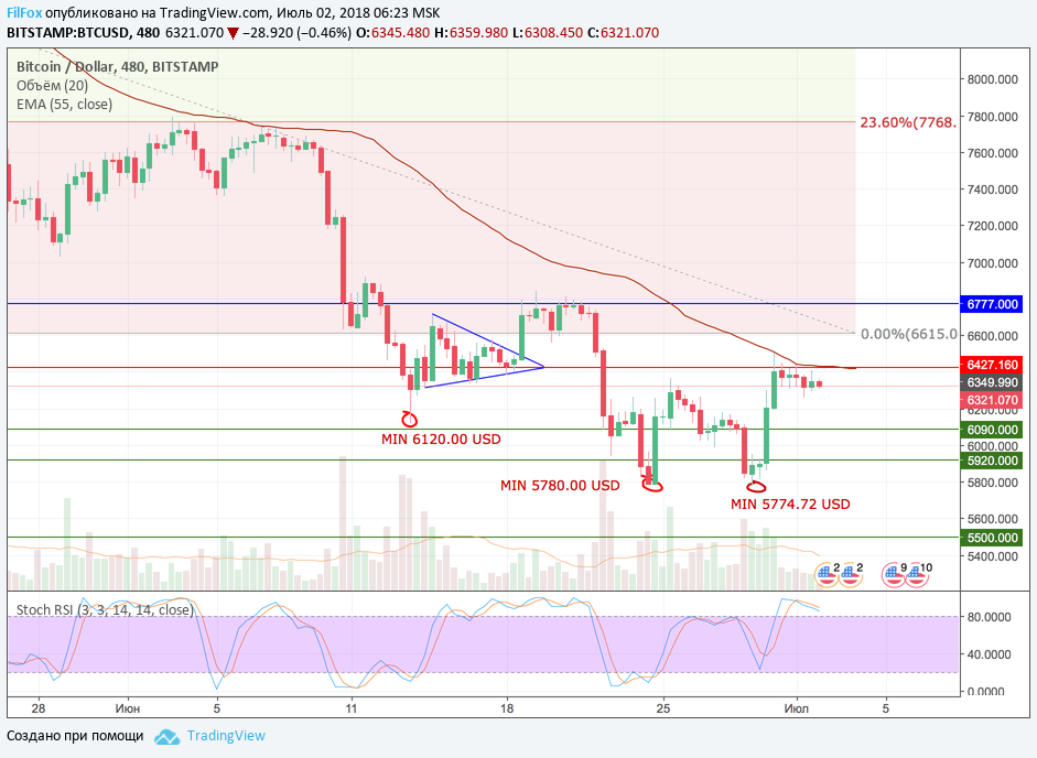 Однако нельзя не обратить внимание на тот факт, что индикатор стохастик находится в зоне перекупленности и ещё вчера сформировал сигнал на снижение. Если из фазы консолидации пробой будет медвежий, то пара BTC/USD снизится к уровню поддержки 6090.00 USD. От этого уровня поддержки попытки пробить сопротивление EMA55 - усилятся. Но сползание цены ниже уровня 5920.00 USD спровоцирует обновление годового минимума.