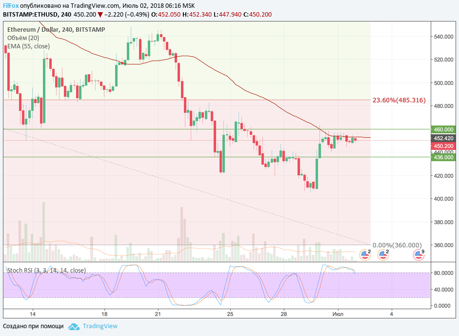 Пара ETH/USD в воскресенье продолжила боковик, начавшийся в субботу. Цена пары консолидировалась в боковом коридоре между двумя зелёными линиями $460 и $436, внутри которого боролась с сопротивлением скользящей средней EMA55. Как правило, выход из такого сужающегося диапазона должен проходить в направлении тренда. То есть рост, начавшийся 29 июня, должен продолжиться к своему ближайшему целевому уровню 23.6% фибо (485.31 USD).