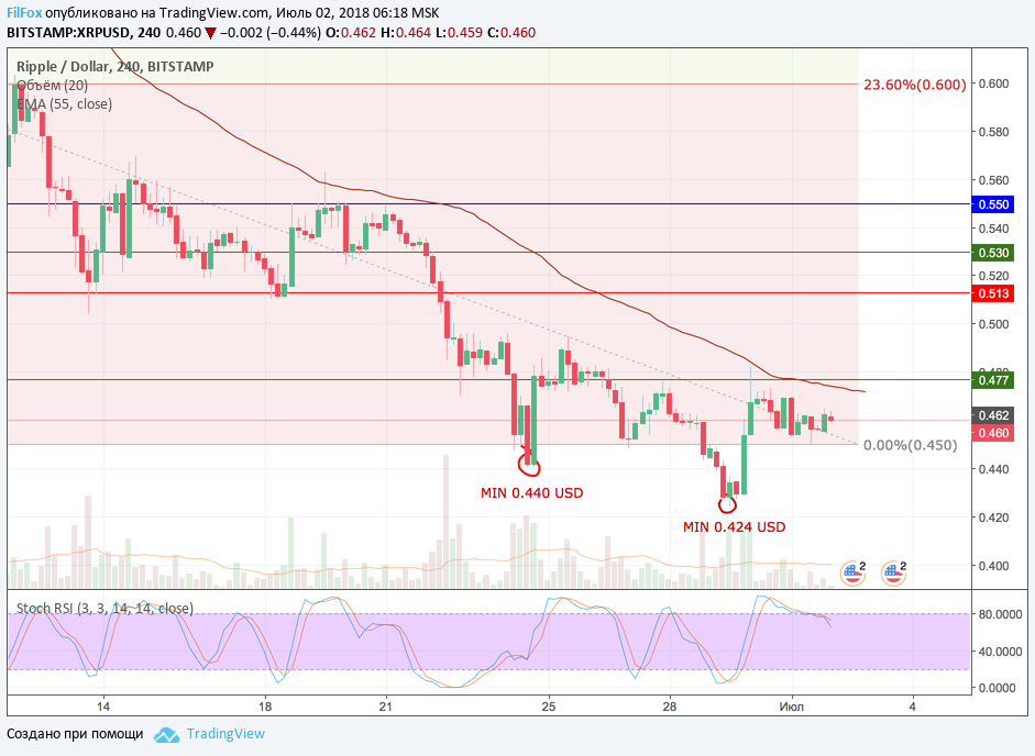 Ripple вчера коснулся нулевого уровня фибоначчи (0.450 USD) и продолжил боковое движение над этим уровнем поддержки. Дальнейшее снижение цены, приведёт к прорыву 0% фибо (0.450 USD) и падению пары XRP/USD в область, между 0.420 USD - 0.400 USD.