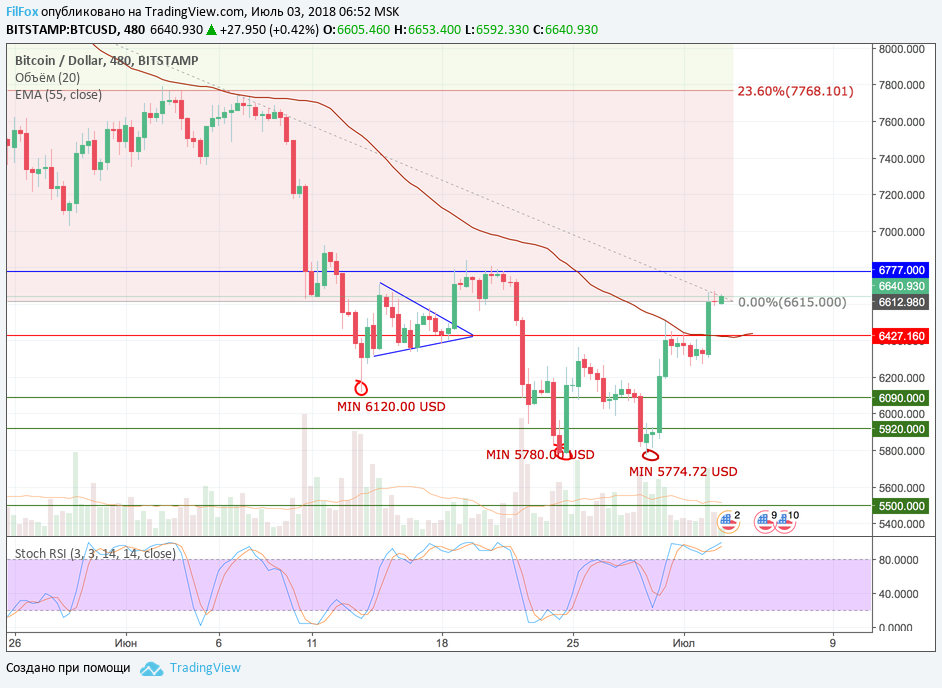 Несмотря на то, что стохастик находится глубоко в зоне перекупленности, сигнала на снижение пока нет. Это говорит о том, что после непродолжительной консолидации пара BTC/USD может предпринять новую попытку роста и закрепиться выше ключевого уровня сопротивления 6777.00 USD. Если это произойдёт, то значит разворот подтвердится. Глобальный даун-тренд на рынке, который начался 17 декабря 2017 года, сменится на восходящий тренд.