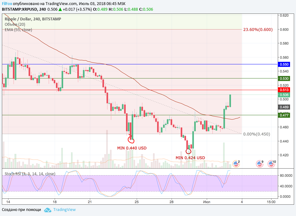 Ripple вчера преодолел сопротивление 0.477 USD и открыл дорогу к психологическому уровню 0.50 USD. Сегодня цена уже пробила важный уровень сопротивления 0.513 USD и нацелилась на ключевой уровень 0.550 USD, который так же является индикатором разворота тренда. Надеемся, что откаты к уровням поддержки не отменят нацеленность пары на поход по восходящему тренду.