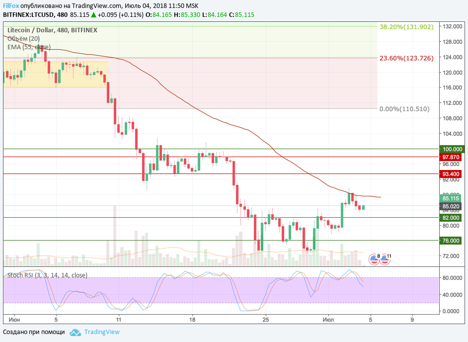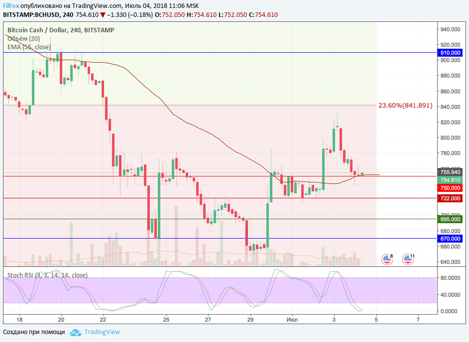 Bitcoin Cash вчера установил максимум на подходе к сопротивлению 23.6% фибо (841.89 USD) и, развернувшись в точке 831.00 USD, откатился к поддержке скользящей средней EMA55, которая в настоящий момент совпадает с красной линией 750.00 USD. Полагаем, что от этой двойной поддержки пара возобновит рост и попробует закрепиться выше уровня фибоначчи 23.6% (841.89 USD).