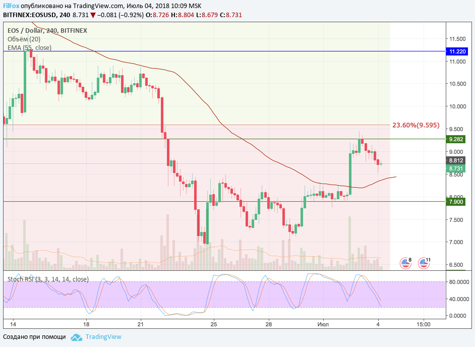 EOS вчера протестировал сопротивление на уровне 9.282 USD и установил дневной максимум на отметке 9.45 USD. В откате пара пыталась присесть на скользящую среднюю EMA55 (8.40 USD), но стохастик сформировал сигнал на рост и цена уже готова к ре-тесту сопротивления 23.6% фибо (9.595 USD). Если сегодня пара не сможет закрепиться выше этого уровня фибоначчи, то откат должен ограничиться всё той же зелёной линией 9.282 USD.