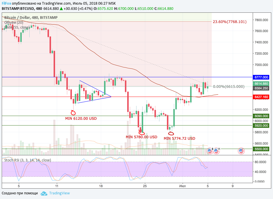 Вчера Bitcoin, используя поддержку скользящей средней EMA55, которая проходит на уровне 6427.16 USD, протестировал ключевое сопротивление 6777.00 USD. Установив максимум в точке 6792.00 USD, цена откатилась к нулевому уровню фибоначчи 6615.00 USD.