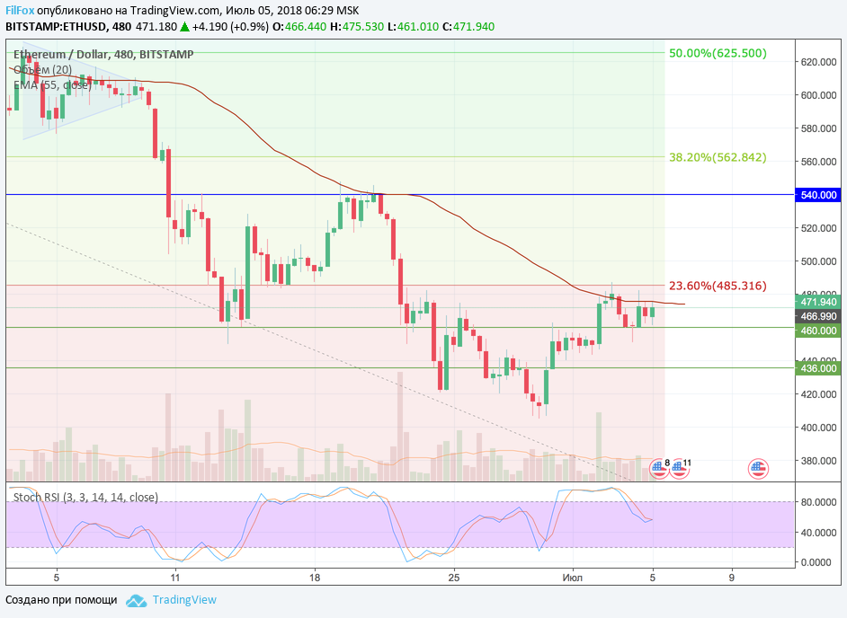Вчера цена Ethereum стартовала от уровня поддержки 460.00 USD, пытаясь пробить уровень сопротивление 23.6% фибо (485.31 USD). Несмотря на уверенный рост в первой половине дня цене не удалось даже коснуться этого уровня сопротивления. Пара встретила серьёзные проблемы при преодолении уровня средних цен, в виде скользящей средней EMA55. Полагаем, что сегодня попытки роста продолжатся и пара сможет закрепиться выше уровня фибоначчи 23.6% (485.31 USD).