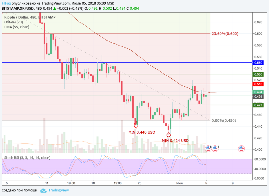 Вчерашний прогноз по паре XRP/USD оказался слишком оптимистичным. Используя поддержку уровня 0.477 USD, пара не смогла преодолеть уровень скользящей средней EMA55, который находился на подступах к сопротивлению 0.513 USD. В итоге эта высота оказалась вчера в недосягаемости для Ripple.