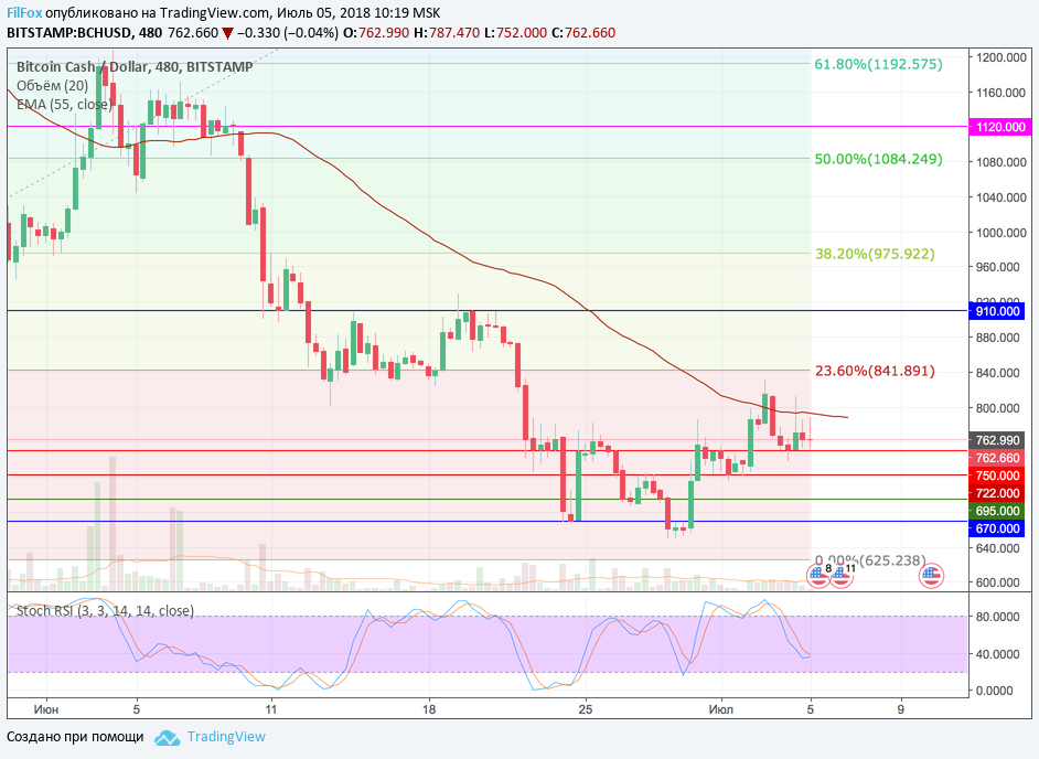 Bitcoin Cash вчера не смог протестировать целевой уровень фибоначи 23.6% (841.89 USD). Восхождение прервала скользящая средняя EMA55, которая отправила пару к уровню поддержки 750.00 USD. Полагаем, что сегодня цена будет консолидироваться в районе этого уровня, сужая диапазон. Возможно, к закрытию дня, пара вновь предпримет попытку пробить уровень средних цен и протестировать сопротивление 23.6% фибо (841.89 USD).