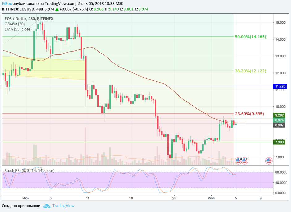 Вчера EOS, после отката, пытался разобраться с целевым уровнем 23.6% фибо (9.595 USD), но преодолеть сопротивление зелёной линии 9.282 USD не получилось. Цена откатилась к уровню средних цен в виде скользящей средней EMA55. В настоящий момент пара до сих пор находится в сужающемся боковике на уровне средних цен. Полагаем, что боковик ещё продлится, но в скором времени пара EOS/USD предпримет более удачливую попытку ре-теста целевого уровня фибоначчи 23.6% (9.595 USD).