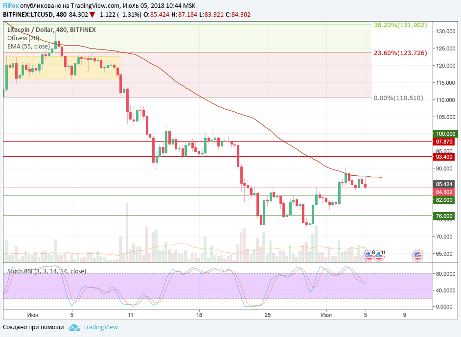 Litecoin вчера в первой половине дня установил дневной максимум в точке 89.49 USD и, не достигнув целевого рубежа 93.40 USD, откатился ниже уровня скользящей средней EMA55. Очень похоже, что некоторое время цена будет консолидироваться в узком диапазоне под этим уровнем, но к закрытию дня, всё же предпримет попытку протестировать уровень сопротивления 93.40 USD.