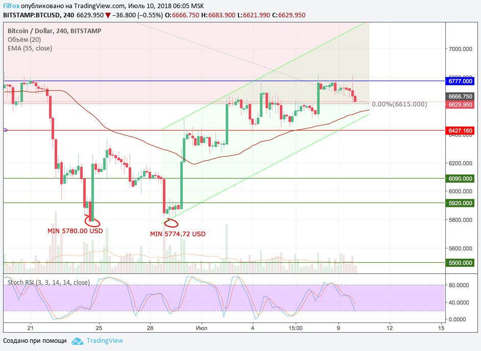 Напомню, что это всё происходит в ту ночь, когда все участники рынка следят за динамикой пары BTC/USD, в ожидании прорыва ключевого уровня сопротивления 6777.00 USD, чтобы убедиться в смене глобального даун-тренда на восходящий тренд. В такие минуты неопытному трейдеру легко поддаться эмоциям и натворить массу глупых ошибок, в попытке «всех обыграть» и купить на старте взлёта или слить на хаях.