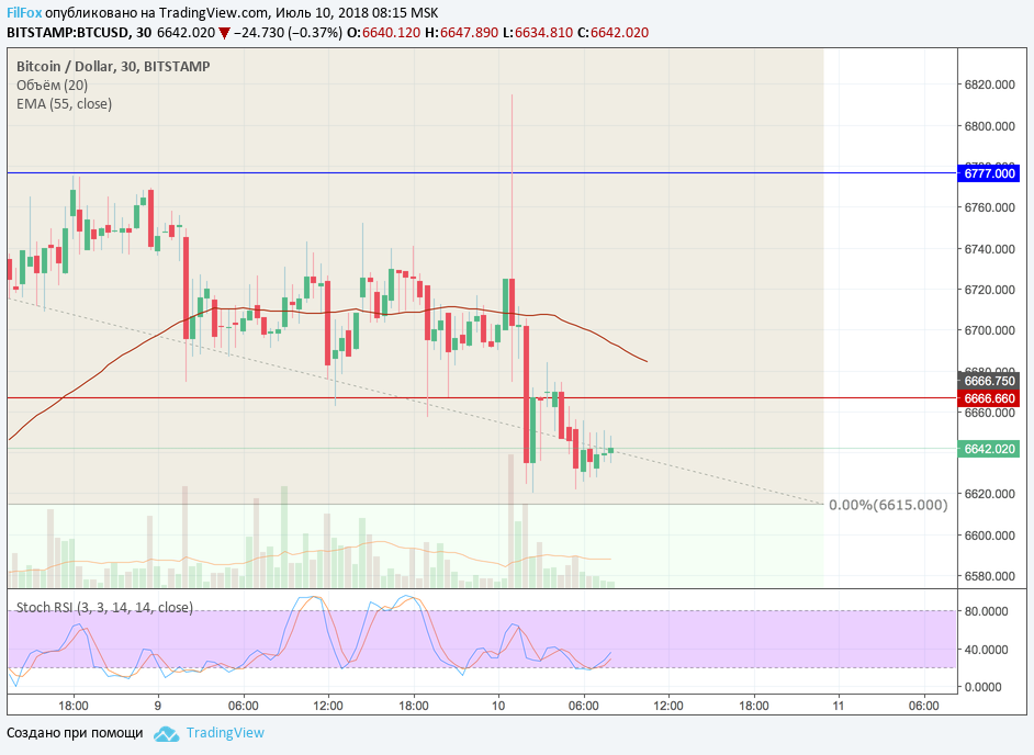 Вчера в течение дня цена Bitcoin снижалась и закрылась на уровне 6691.00 USD. Сегодняшний день начался с того, что цена от уровня закрытия за час подпрыгнула до отметки 6724.00 USD. Далее события начали развиваться очень стремительно. Через десять минут цена проколола ключевой уровень сопротивления 6777. 00 USD, оставив отметину в точке 6814.00 USD. Но потом, в течении полутора часов, цена успела упасть к нулевому уровню фибоначчи, коснувшись минимума в точке 6620.00 USD.