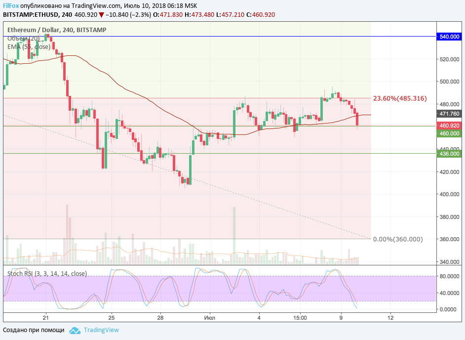 Вчерашний день для Ethereum протекал в умеренном снижении цены и закрытие котировок завершилось на прогнозируемом уровне средних цен, в области 470.00 долларов за эфир. Сразу после этого цена резко рванула вверх, а потом упала на уровень поддержки 460.00 USD. Когда нервы и без того напряжены такая динамика бодрит лучше любой чашки кофе. На данный момент цена от уровня поддержки начала восстанавливаться к прежнему уровню средних цен. Боковик пока продолжается.