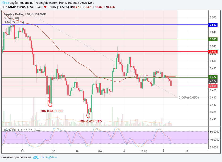 Сейчас цена вроде бы приостановила снижение и решает, будет ли она пользоваться поддержкой нулевого уровня фибоначчи 0.450 USD или сразу пойдёт на прорыв уровня 0.513 USD.