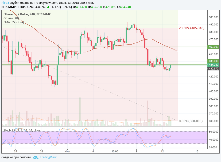 Ethereum вчера пробил нижнюю границу бокового диапазона и установил минимум в области цен 420.00 долларов за эфир. Развернувшись в точке минимума, цена сегодня смогла восстановиться к вчерашней границе боковика 436.00 USD. Сейчас эфир стоит на пороге более глубокого погружения, которое будет проходить поэтапно. Сначала цена протестирует уровень 415.00 USD, а потом 394.00 USD. На следующей неделе ожидаем обновление первоапрельского минимума в области нулевого уровня фибоначчи - 360.00 USD.