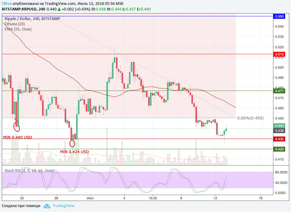 Ripple проколол уровень поддержки 0.430 USD и развернувшись в точке минимума 0.425 USD, восстановился до уровня текущих цен - 0.442 USD. Полагаем, что от этого уровня пара возобновит снижение к целевой отметке 0.420.00 USD, которая будет достигнута на предстоящих выходных. После обновления годовых минимумов снижение замедлится в боковике с поддержкой в области 0.400 USD.