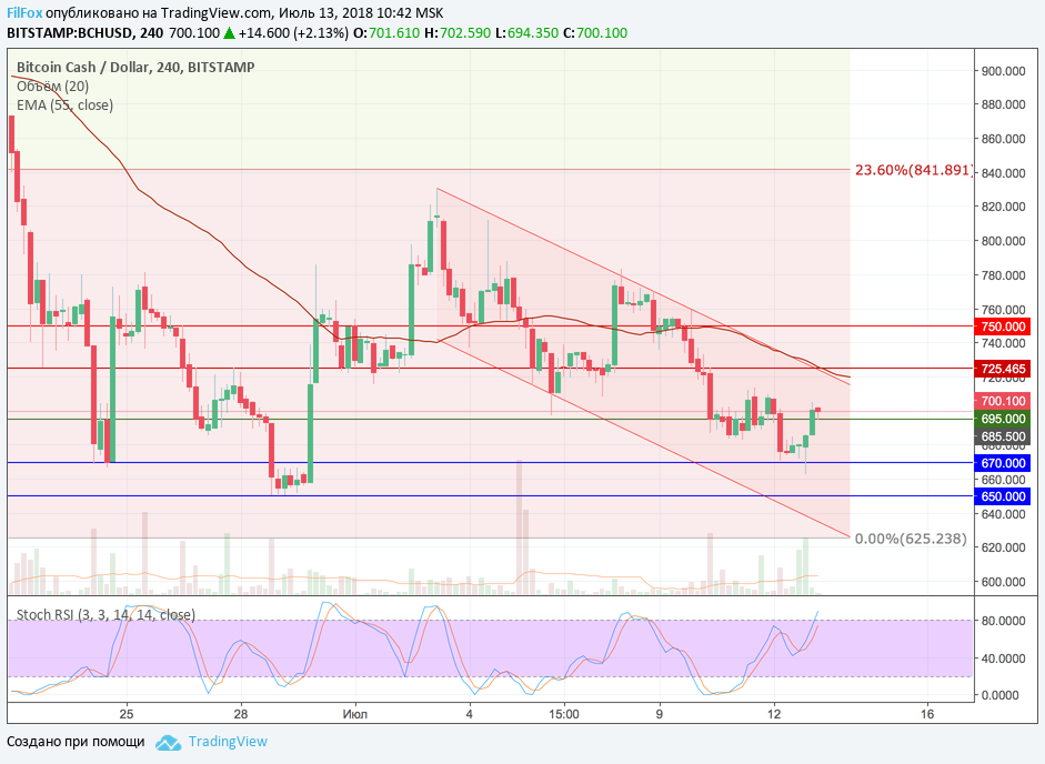 Вчера пара протестировала уровень 670.00 USD, который приостановил падение Bitcoin Cash и отбил цену к максимуму 705.00 USD. Сегодня падение возобновится, но вряд ли успеет достигнуть ожидаемого в прогнозе уровня 650.00 USD. Полагаем, что это произойдёт на выходных.