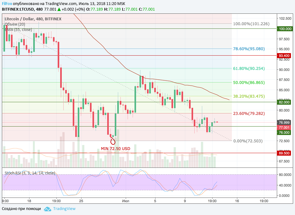 Litecoin вчера остановил падение в точке минимума 74.28 USD, так и не добравшись до целевого уровня 72.00 USD. Во второй половине дня пара смогла неплохо восстановиться, а сегодня зафиксировать дневной максимум на уровне 77.18 USD.