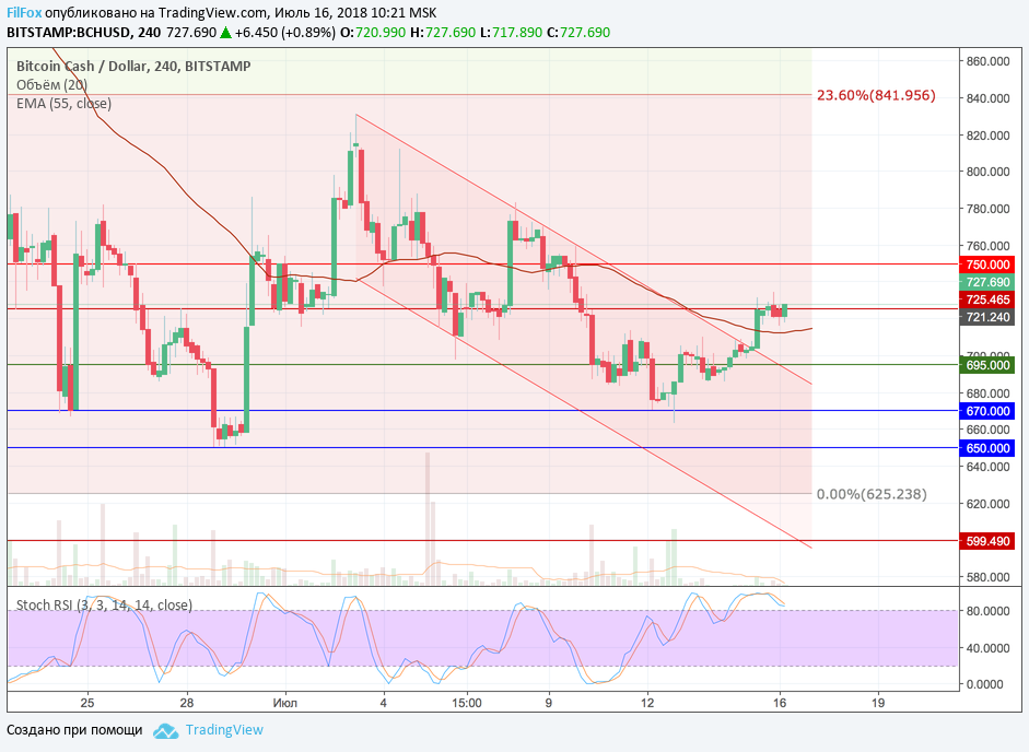 После того, как на выходных цена консолидировалась на уровне поддержки 695.00 USD, пара BCH/USD, на очень малых объёмах, существенно прибавила в цене и пробила верхнюю границу коридора снижения. В воскресенье ей удалось прорваться сквозь сопротивление EMA55 и консолидироваться на уровне 725.46 USD.