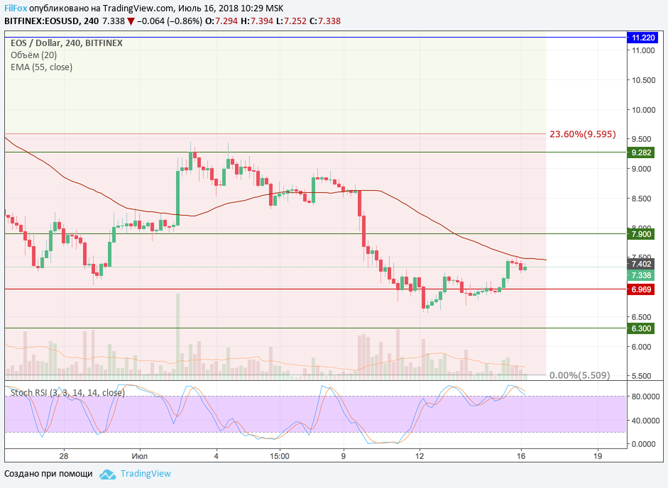 В воскресенье, пара EOS/USD из зоны комфорта (9.969 USD) выросла к уровню средних цен и протестировала скользящую среднюю в области 7.500 USD. Полагаем, что при слабой поддержке покупателей цена вернётся на линию консолидации 9.969 USD и продолжит боковик, расширяя нижнюю границу диапазона до уровня 6.500 USD. Снижение к целевой поддержке 6.30 USD немного сдвигается по времени и ожидается к завершению рабочей недели.