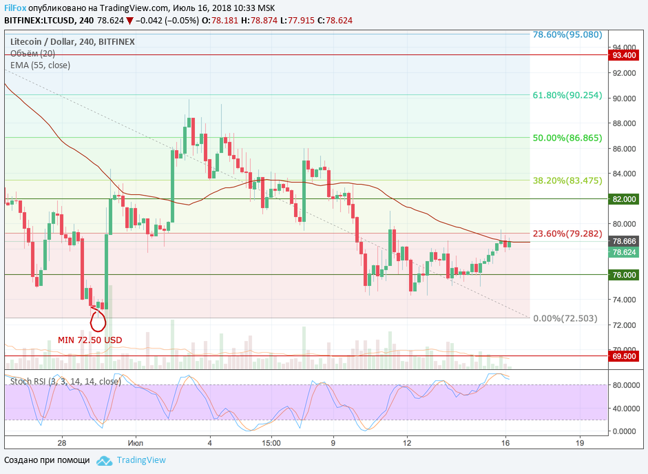 В ближайшее время цена будет свободно ходить в коридоре между 23.6% фибо (79.28 USD) и зелёной линией 76.00 USD. Но медвежье давление вскоре возобновиться и тогда нас ожидает ре-тест нулевого уровня фибоначчи (72.503 USD). Поэтому наш прогноз, по прежнему, актуален и может реализоваться уже в завершении текущей недели.