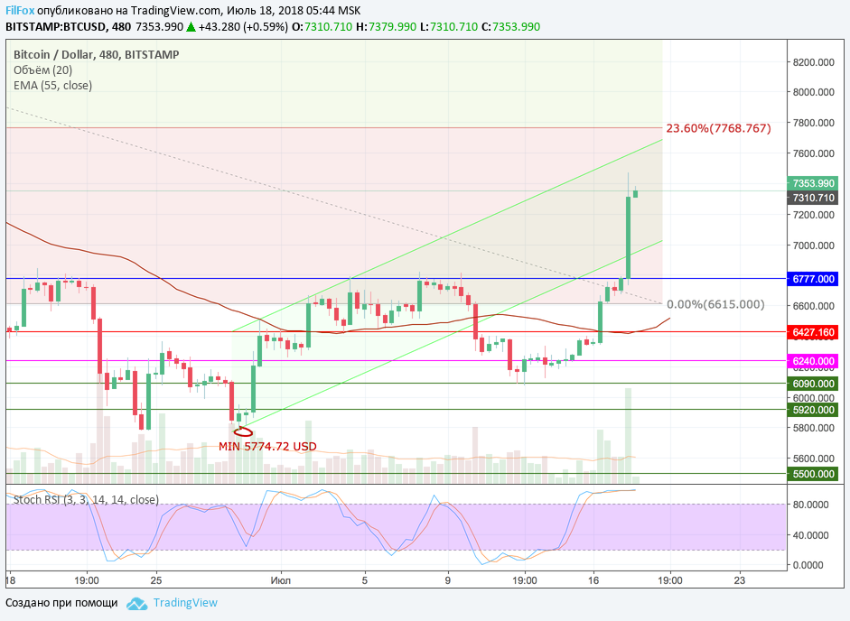Вчера вечером, цена Bitcoin проколола ключевой уровень сопротивления 6777.00 USD. После этого, события стали разворачиваться очень быстро. В первые пять минут цена подпрыгнула до 6900.00 USD. Ещё минут через пять, цена уже была на уровне 7200.00 USD. Этот уровень мы вчера определили в качестве первой цели после прорыва 6777.00 USD, но не думали что она отработает так быстро. На уровне 7200.00 USD цена боролась за следующий рубеж всего минут пятнадцать.